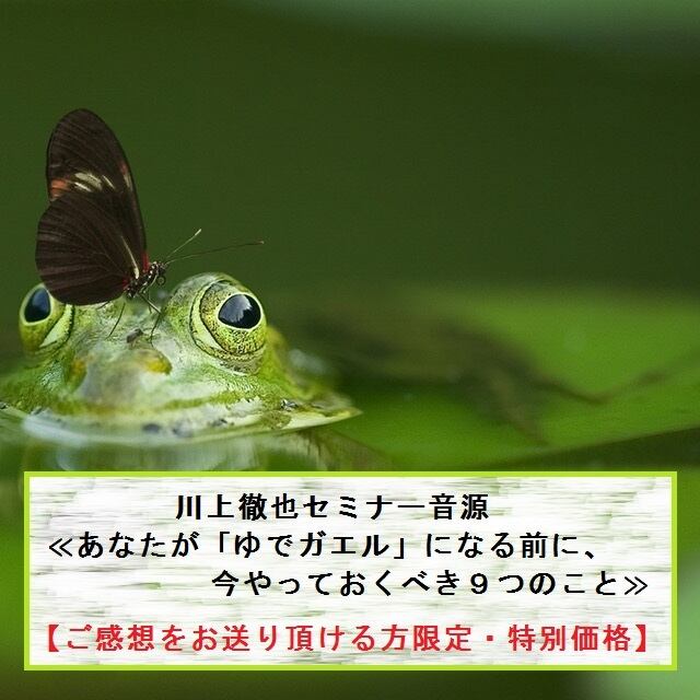 【ご感想をお送り頂ける方限定・特別価格】川上徹也セミナー音源≪あなたが「ゆでガエル」になる前に、今やっておくべき9つのこと≫■収録時間:約3時間6分 ※価格:16,300円(税込) | 『旗をかかげ生きよう』 セミナー音源案内ページ